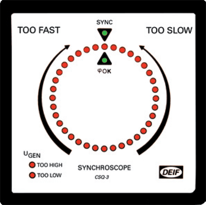 Iskra SQ 0214 synchroscopes with LCD display & magnified circular Δ phase LEDs.